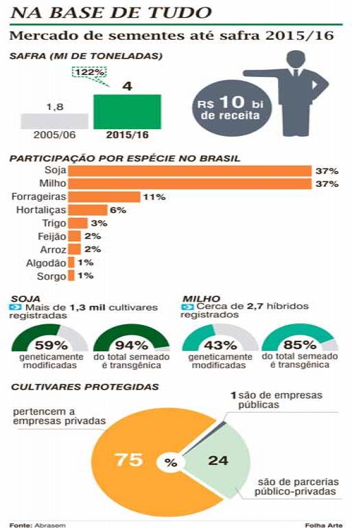 O mercado de sementes movimenta R$ 10 bilhões ao ano no Brasil, que tem a terceira maior indústria do mundo no setor, atrás de Estados Unidos e China, segundo a Associação Brasileira de Sementes e Mudas (Abrasem). O mercado cresceu 122% em dez anos, ao passar de 1,8 milhão de toneladas na safra 2005/06 para 4 milhões em 2015/16.